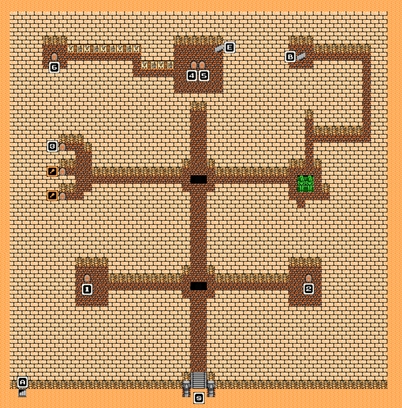 Now it’s time for Pyramid: Round II. Before you set out, be sure to fill up everyone’s inventory with Medical Herbs to make up for the loss of your party’s magic in the basement. Upon entering the Pyramid and before climbing its steps, head directly west and down staircase [A]. On B1, you’ll need to Search for staircase [C] before it appears. Descend to B2. Take the Golden Claw from the coffin (equip it on your Fighter if you’ve got one) and begin the trek back out. Return to town and sell the claw for a tidy sum. And toss your Thief’s Key in the Aliahan vault, as we won’t be needing it anymore. The Magic Key is just that good.