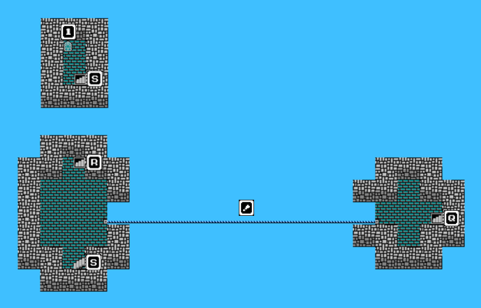 On 2F, cross the tightrope and take the [E] stairs back down to 1F. Take the portal [F] to the middle of the 1F map, where you’ll see three staircases going up. The [G] path leads to 3F’s paltry 248 G chest, while the [I] path leads to a trapped chest and should be avoided. Taking [H], [M], [O], [Q] will lead you to 5F and another tightrope. If you want an Iron Helmet, cross the tightrope and take the [S] stairs up to the one-room 6F (which I’ve just stuffed into the corner of the 5F map).