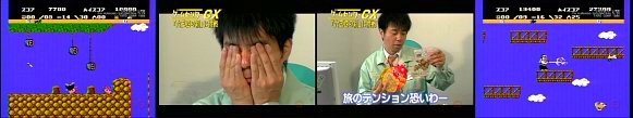 It’s a tough one, though, thanks to Hattori-kun’s slow movements. Arino dies once before ending stage 1, then turns it off and reaches for the next game: Gegege no Kitaro. He starts the game and, after about 7 seconds, he jumps into an enemy and dies. Arino’s silent while Kibe can’t contian his laughter. The second and third tries end just as quickly. Arino grabs the pig ball and slams it on the table.