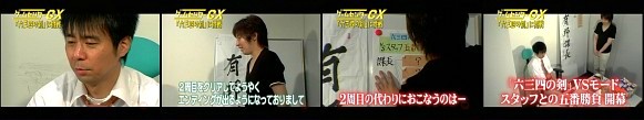 Of course, Tojima would have to be the one who did kendo in real life — guess that’s why he was last. He immediately gets the first strike. And then the second. That was what, 10 seconds? Arino whacks him with the massage stick from Korea. Grah! But he won anyway, so it’s all good.