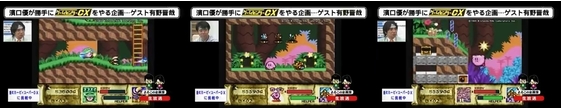 Conveniently (I’m sure), all the games feature two-player modes in some way. Much like the playtest segment a couple of hours ago, the duo sample some of the games for a few moments, Hamaguchi prefacing each one with his own overdone versions of Arino’s "kacho ON" catchphrase. They try SonSon, Ice Climber, Mario Bros., and Kirby Super Star. Which one will they try to finish?