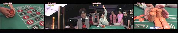 Next is Dai-Shou, the dice game Arino kicked ass at in last episode’s Goemon challenge. Can he replicate his success in real life? First roll: no. Second roll: no. He’s just about to leave when the producer chimes in and suggests the rest of the staff pitch in a few bucks and help Arino do his best at the roulette table. He goes for it, and each of the crew put on a cold pad and toss in a big bill, ending up with more than $570. Is this on the company dime?
